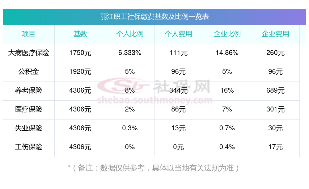 丽江2025年社保缴费个人和公司各承担多少?丽江五险一金每月最低交多少?下表是2025年丽江社保费用明细参考,新社通app-社保缴费查询工具提供的最新数据如下: