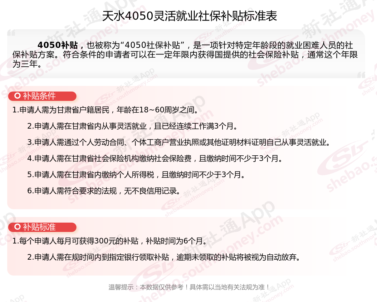 一、2025年天水灵活就业4050社保补贴标准是多少?申请条件是什么?