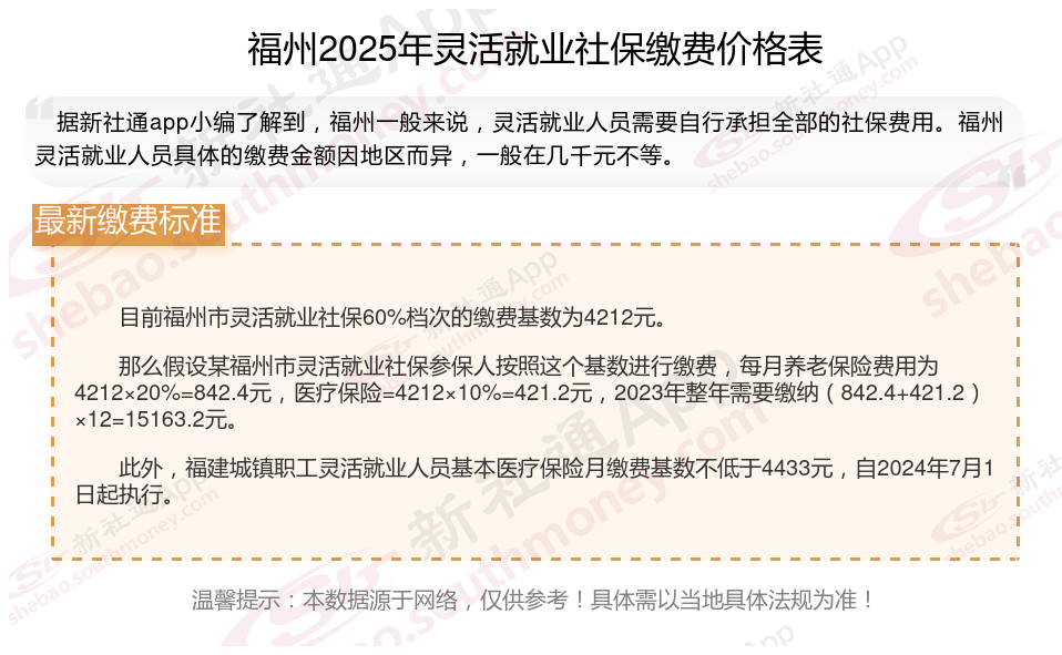 目前福州市灵活就业社保60%档次的缴费基数为4212元。