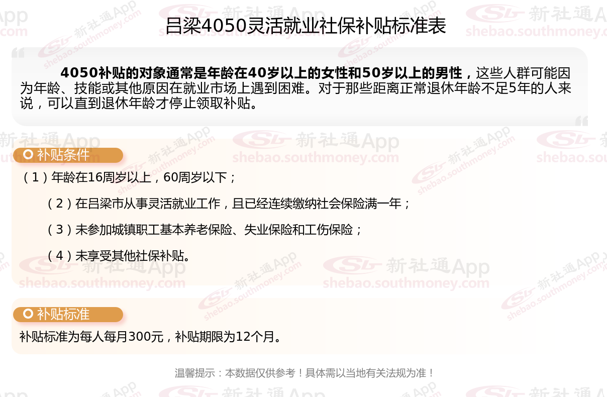 二、吕梁4050社保补贴标准及条件4050社保补贴,最新如下