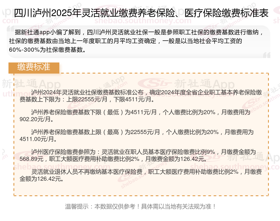 据新社通app数据显示,四川泸州灵活就业养老缴费基数明细如下: