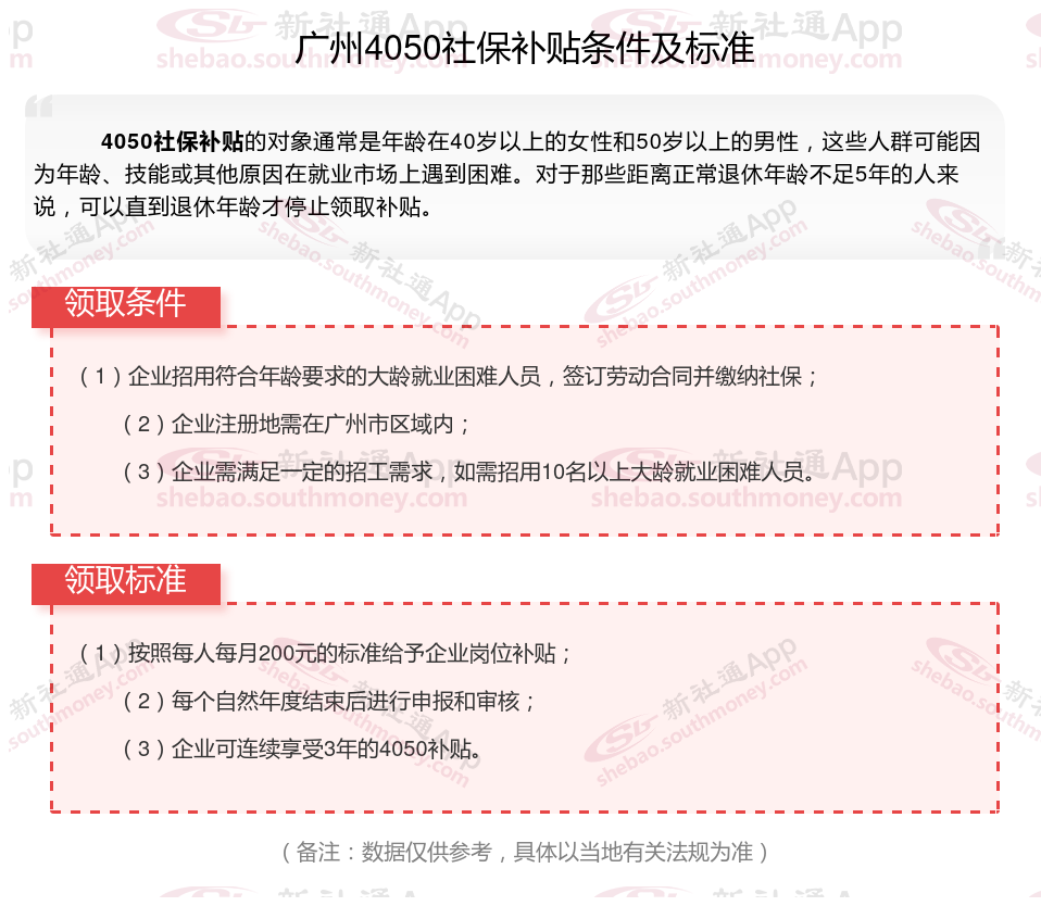 广州4050灵活就业社保补贴是什么?今天聊一下4050补贴话题。4050补贴听起来像是一个针对特定年龄人群的社保补贴。比如女性需年满40周岁,男性需年满50周岁(以申请当年12月31日为截止日期)。那么广州4050灵活就业社保补贴标准是多少钱?广州4050社保补贴可以领取多少?接下来随新社通APP小编了解一下广州4050灵活就业社保补贴的最新资讯。