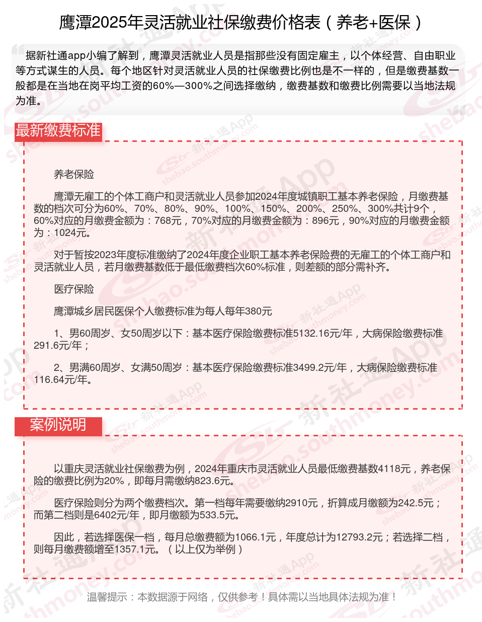 据新社通app数据显示,2024-2025年鹰潭灵活就业人员养老保险的缴费标准: