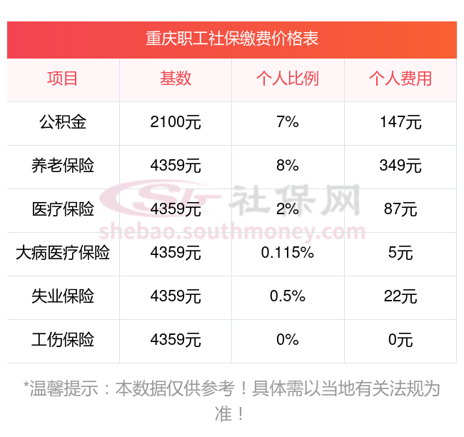 2025年重庆5险缴费标准是多少,2025年重庆社保缴费多少钱?下表是2025年重庆社保费用明细参考,新社通app-社保缴费查询工具提供的最新数据如下: