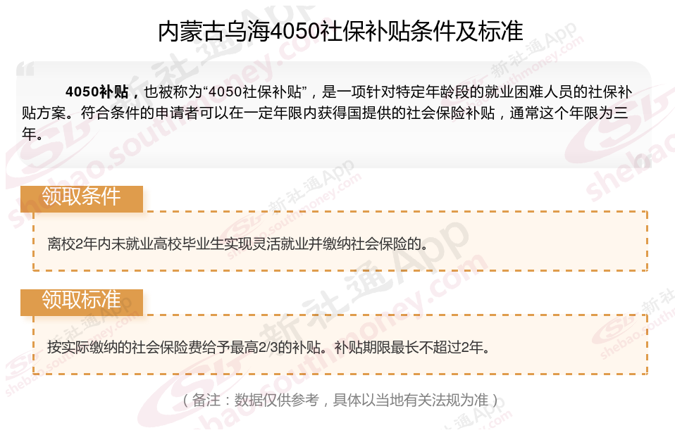 一、2025年内蒙古乌海4050社保补贴标准及条件是多少?