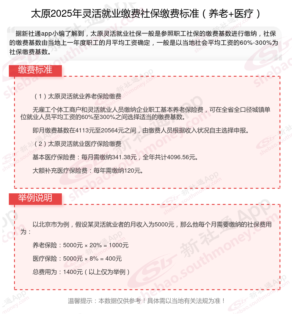 据新社通app数据显示,2024-2025年太原灵活就业人员养老保险的缴费标准是根据缴费基数来确定的: