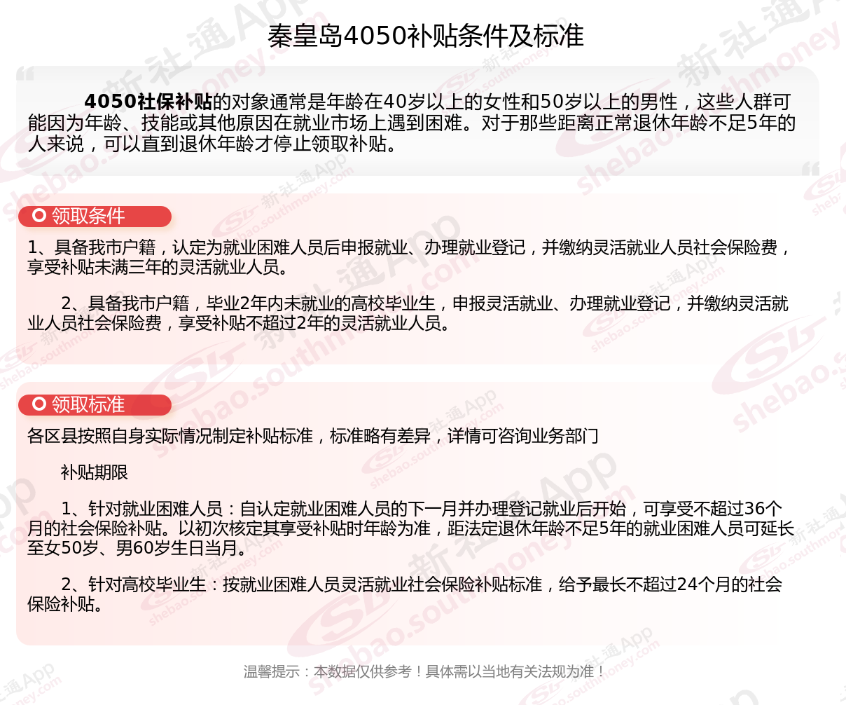 今天聊一下4050补贴话题。4050补贴听起来像是一个针对特定年龄人群的社保补贴。比如女性需年满40周岁,男性需年满50周岁(以申请当年12月31日为截止日期)。那么秦皇岛4050灵活就业社保补贴标准是多少钱?秦皇岛4050社保补贴条件是什么?接下来随新社通APP小编了解一下最新资讯。