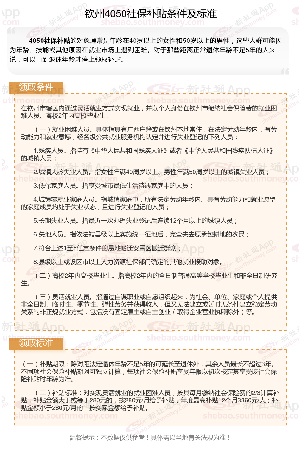 二、2025年钦州4050社保补贴标准及条件,最新如下: