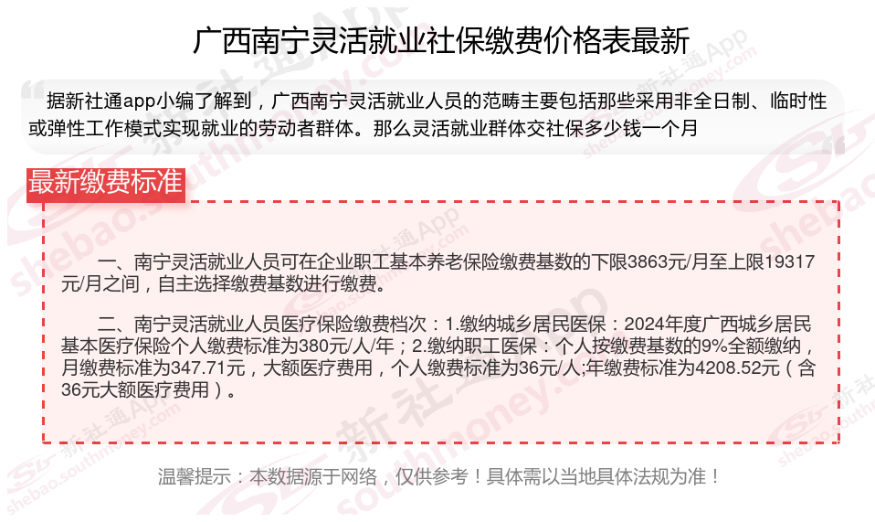 那么,广西南宁个人社保一个月多少钱?根据新社通app-社保缴费查询工具提供的2025社保缴费标准详情数据: