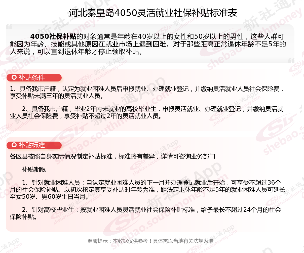 一、河北秦皇岛4050社保补贴标准是什么?附条件