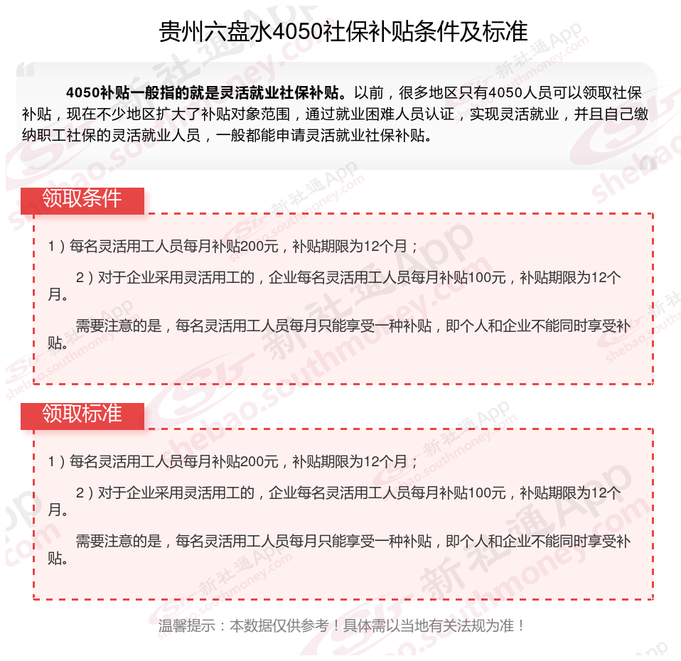 贵州六盘水4050灵活就业社保补贴是什么?今天聊一下4050补贴话题。44050社保补贴标准据新社通app小编了解,通常,4050社保补贴包含基本医疗保险和基本养老保险两个险种,社保补贴金额为申请人实际缴纳基本养老保险和基本医疗保险金额的2/3,具体标准以当地社保局公布的数据为准!那么贵州六盘水4050灵活就业社保补贴标准是多少钱?贵州六盘水4050社保补贴可以领取多少?接下来随新社通APP小编了解一下贵州六盘水4050灵活就业社保补贴的最新资讯。