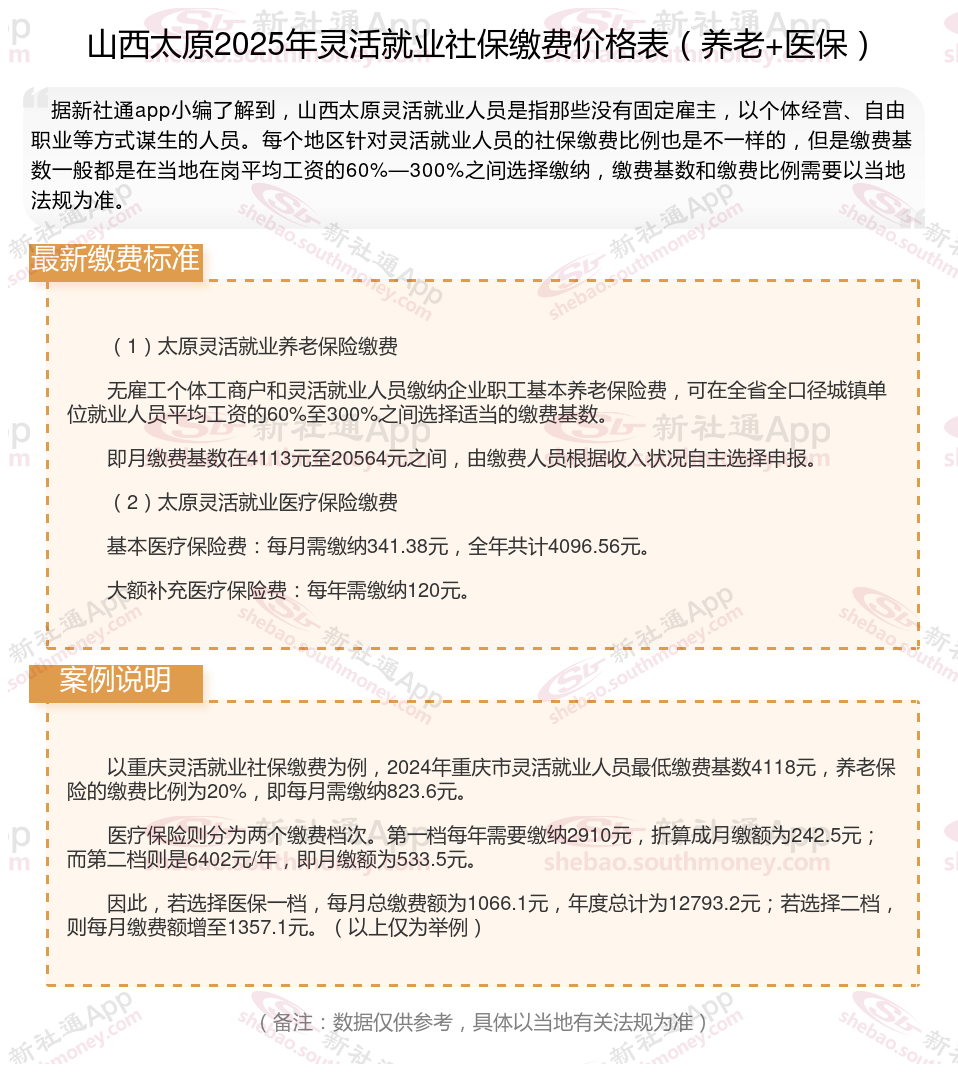 据新社通app数据显示,2024-2025年山西太原灵活就业人员养老保险的缴费标准是根据缴费基数来确定的: