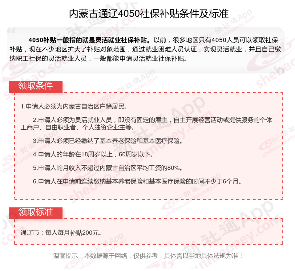二、2025年内蒙古通辽4050社保补贴标准及条件是什么?