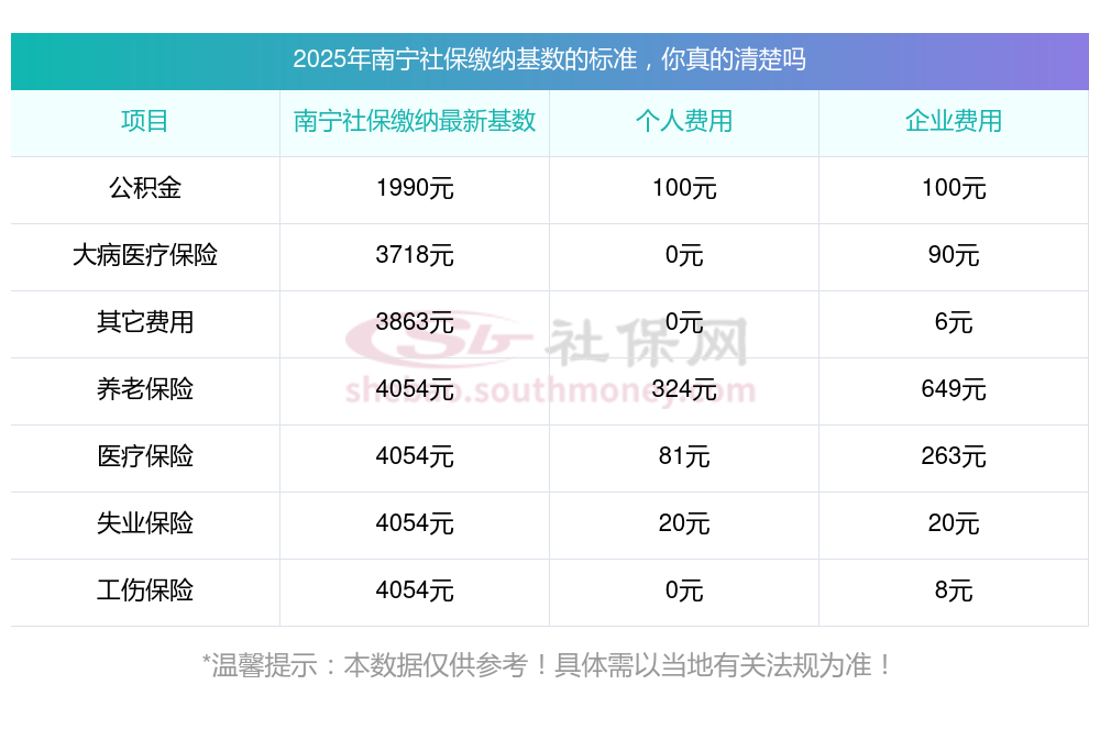 2025年南宁社保缴费价格,2025年南宁社保缴费多少钱?下表是2025年南宁社保费用明细参考,新社通app-社保缴费查询工具提供的最新数据如下: