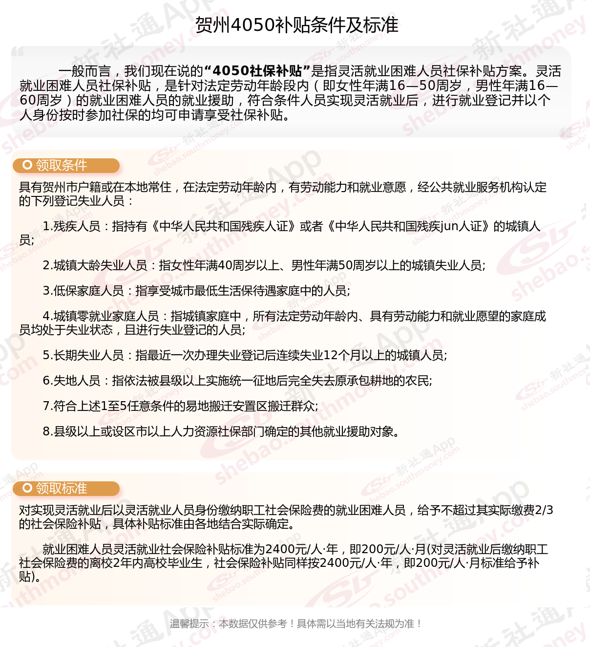 二、2025年贺州4050社保补贴标准及条件,最新如下: