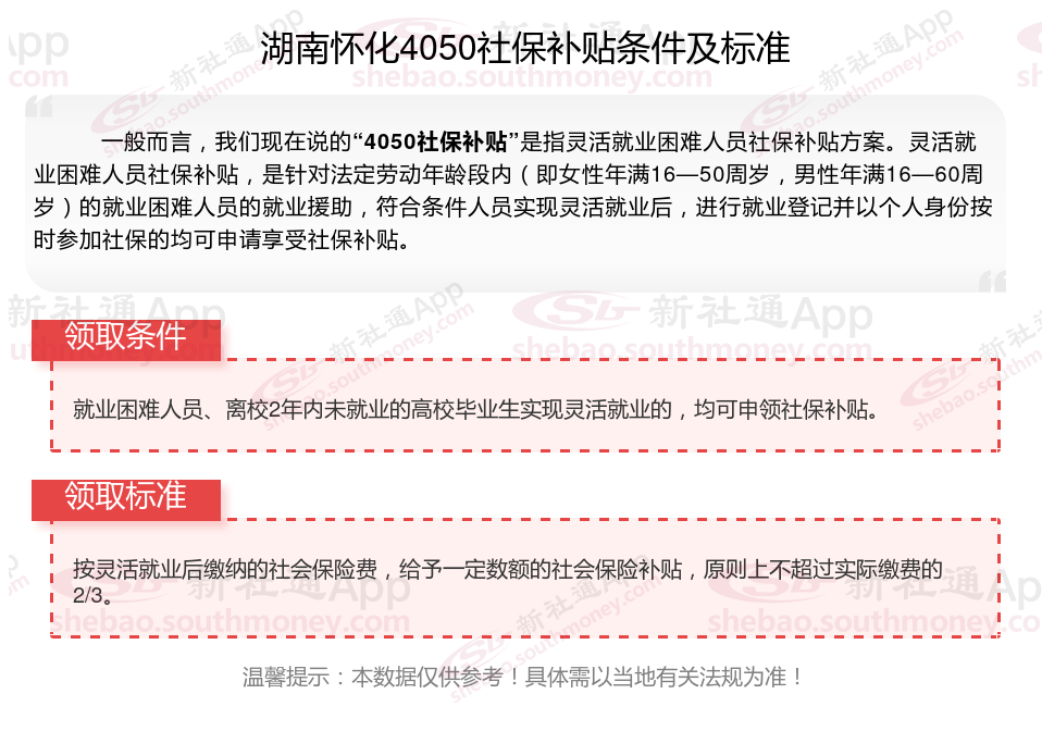 2025湖南怀化灵活就业4050社保补贴是一项面向特定年龄段的就业困难人群的社会保险补贴。