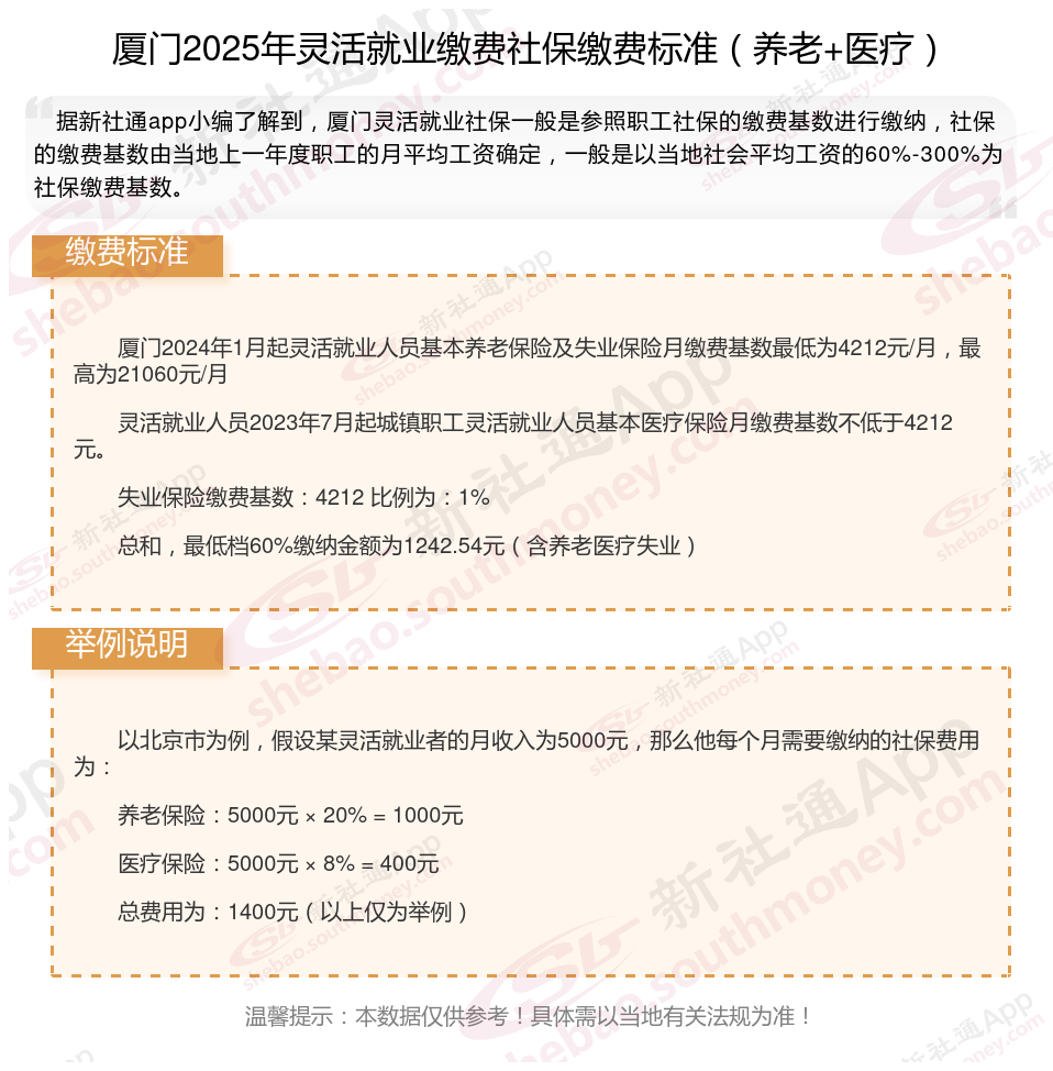 据新社通app数据显示,厦门灵活就业养老保险缴费基数2024-2025年最新标准如下:
