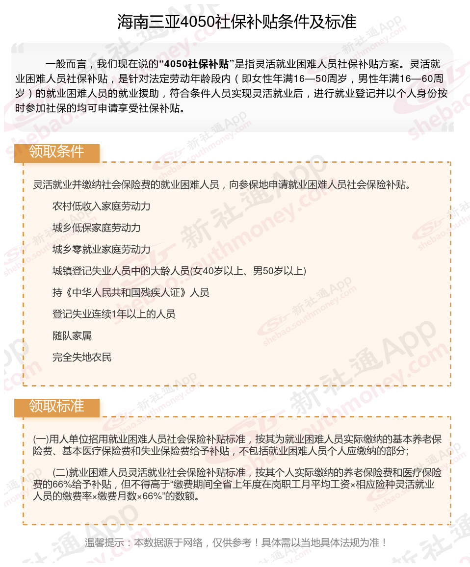 二、海南三亚4050社保补贴标准及条件2025年,最新如下