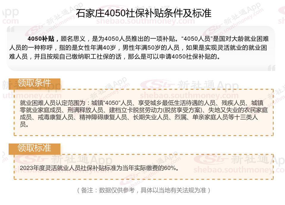 2025石家庄灵活就业4050社保补贴是一项面向特定年龄段的就业困难人群的社会保险补贴。