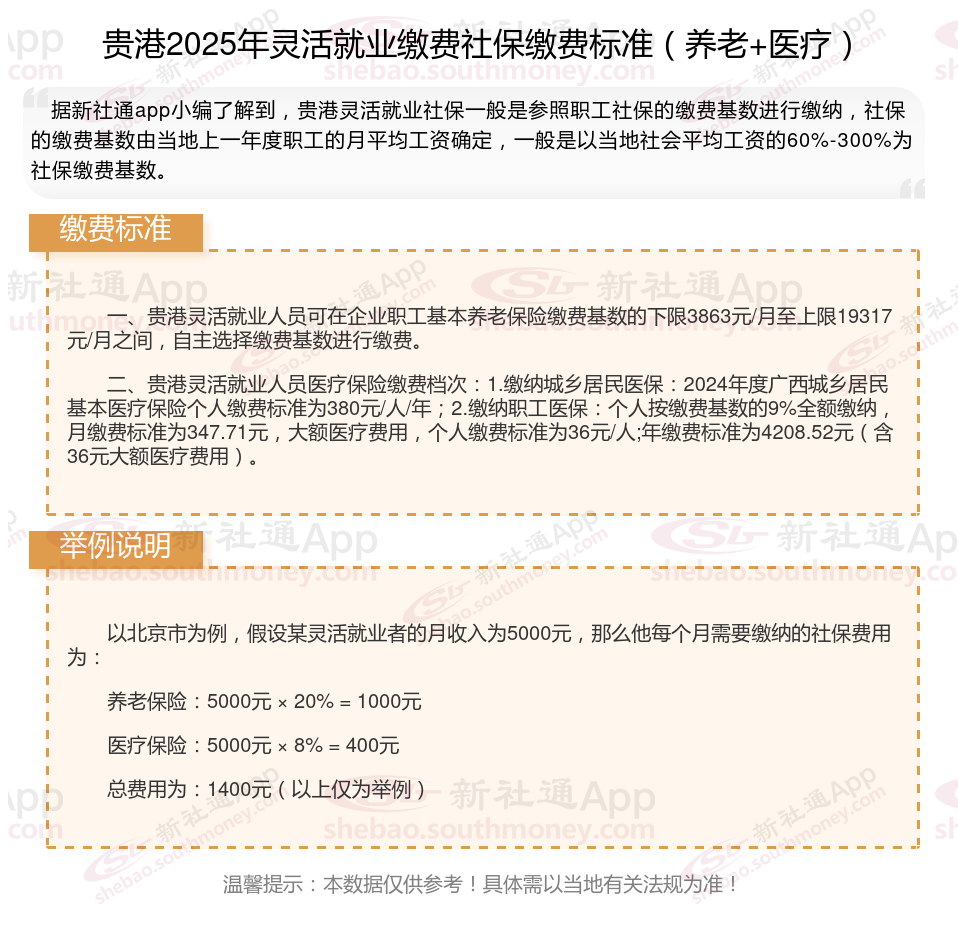 据新社通app数据显示,贵港灵活就业人员养老缴费基数2024-2025年最新标准如下: