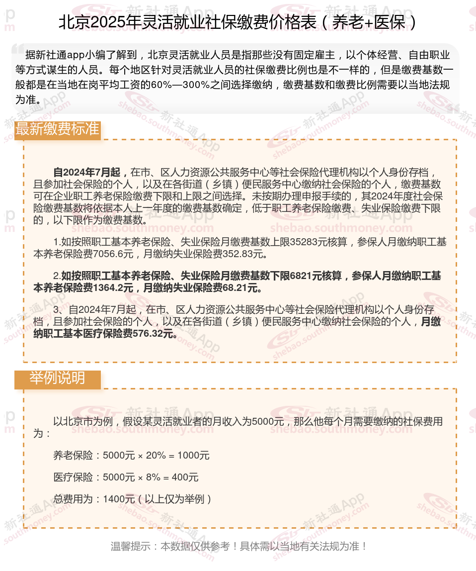 据新社通app数据显示,2024-2025年北京灵活就业人员养老保险的缴费标准是根据缴费基数来确定的: