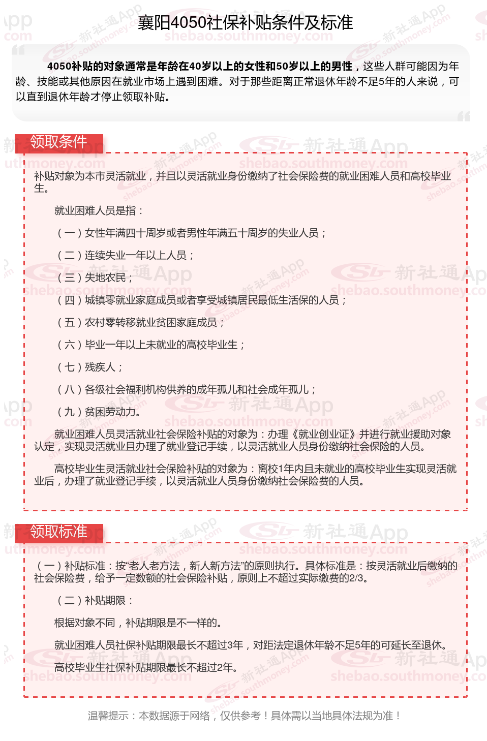 一、2023-2024年襄阳4050社保补贴标准及条件,最新如下