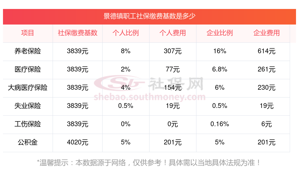 2025年景德镇社保缴费标准是多少,农村户口一共交了多少年社保 下表是2025年景德镇社保费用明细参考,新社通app-社保缴费查询工具提供的最新数据如下:
