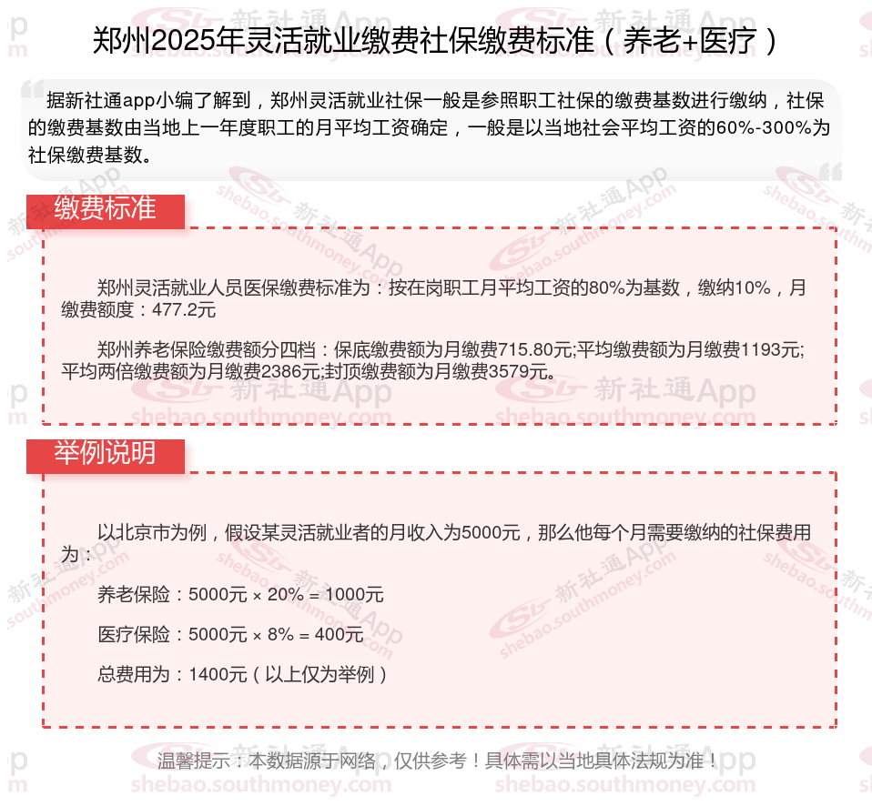 据新社通app数据显示,郑州灵活就业养老保险缴费基数2024-2025年最新标准如下: