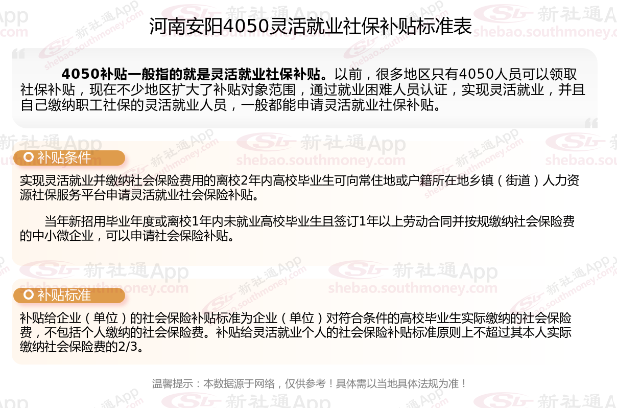 以上就是河南安阳4050灵活就业社保补贴的相关内容,欢迎关注新社通/下载新社通APP了解更多五险一金专业资讯。