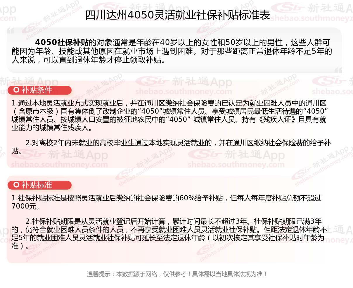 以上就是四川达州4050灵活就业社保补贴的相关内容,欢迎关注新社通/下载新社通APP了解更多五险一金专业资讯。