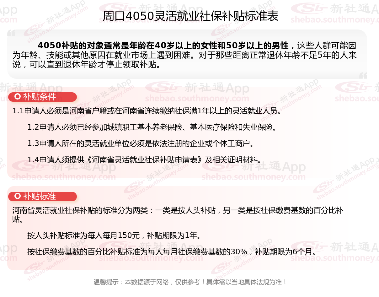 三、周口灵活就业4050社保补贴标准及条件是什么