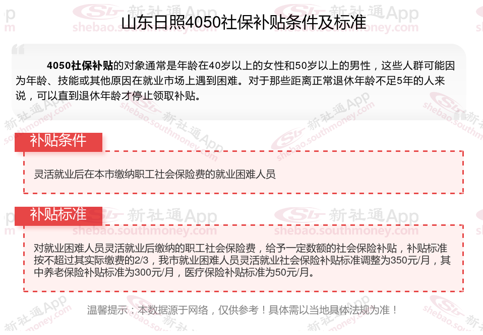 二、2025年山东日照4050社保补贴标准是多少?条件是什么?
