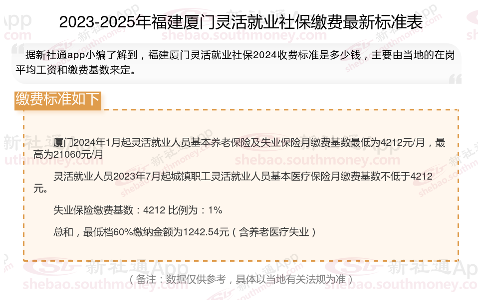 据新社通app数据显示,福建厦门灵活就业养老保险缴费基数2024-2025年最新标准如下: