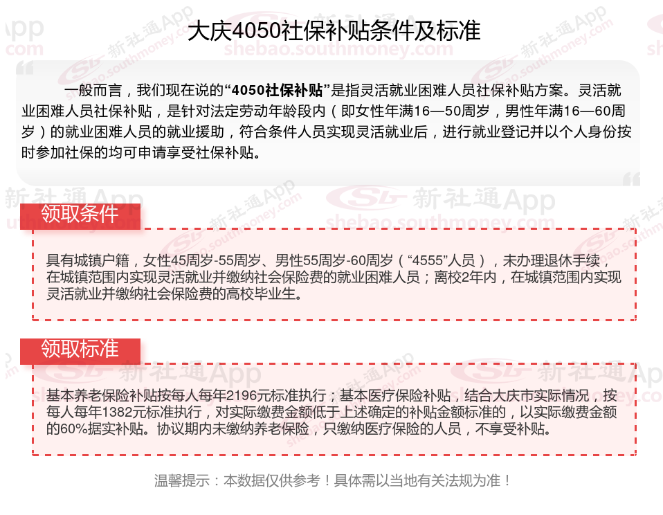 三、大庆灵活就业4050社保补贴标准及条件是什么
