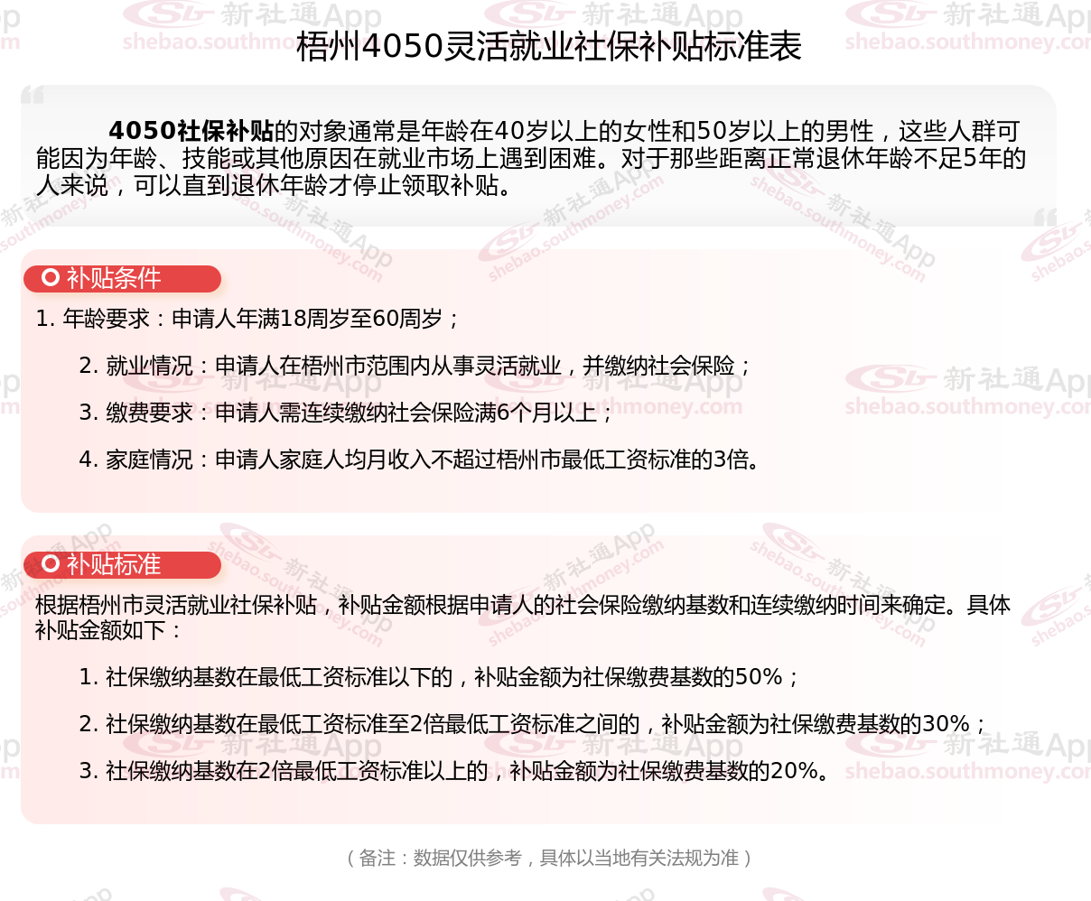 二、2025年梧州4050社保补贴标准及条件,最新如下: