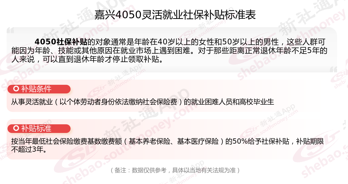 以上就是嘉兴4050灵活就业社保补贴的相关内容,欢迎关注新社通/下载新社通APP了解更多五险一金专业资讯。