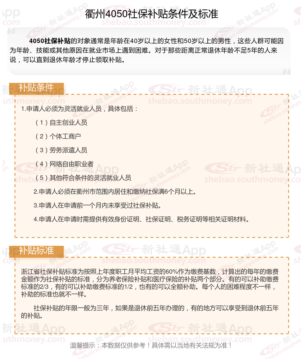 二、2025年衢州4050社保补贴标准是多少?领取条件是什么?