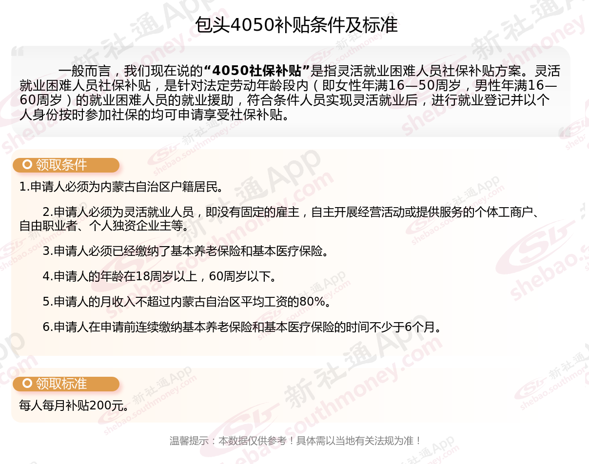 今天聊一下4050补贴话题。4050补贴听起来像是一个针对特定年龄人群的社保补贴。比如女性需年满40周岁,男性需年满50周岁(以申请当年12月31日为截止日期)。那么包头4050灵活就业社保补贴标准是多少钱?包头4050社保补贴条件是什么?接下来随新社通APP小编了解一下最新资讯。