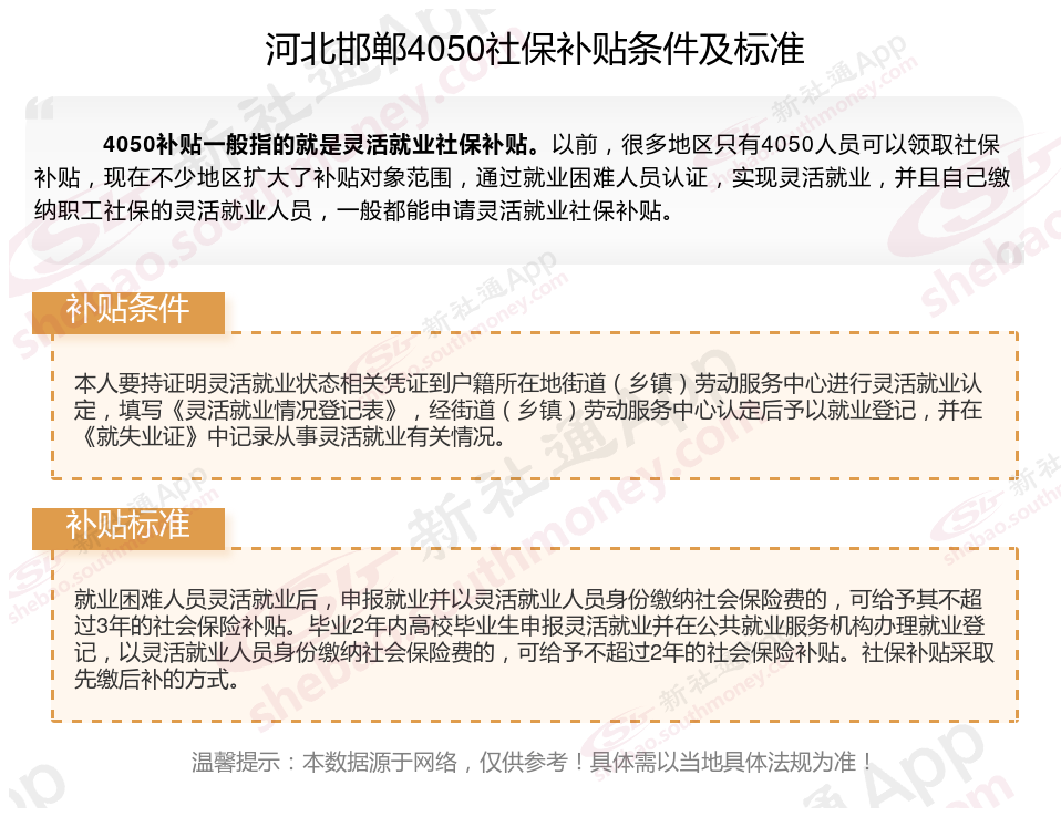 一、2023-2024年河北邯郸4050社保补贴标准及条件