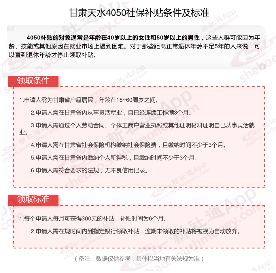 二、2025年甘肃天水4050社保补贴标准是多少?条件是什么?