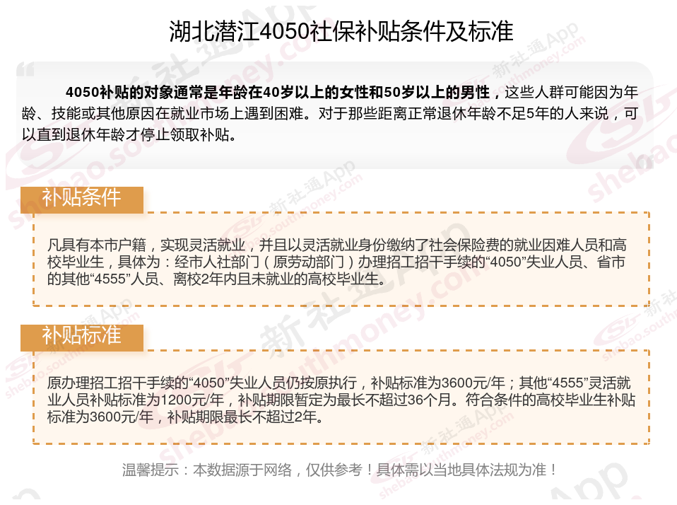 二、湖北潜江4050社保补贴标准及条件2025年最新消息