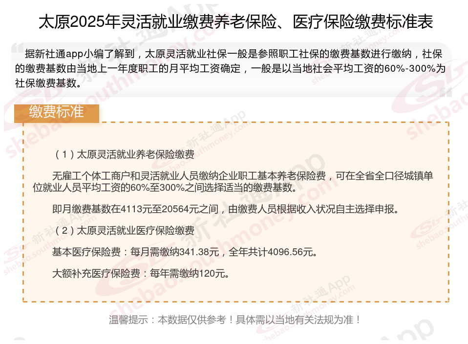 2025年太原城镇职工社会保险缴费基数用人单位及其职工(包括有雇工的个体工商户及其雇工)分别按2024年度全口径省平的60%(4113元/月)和300%(20564元/月)核定缴费基数的下限和上限执行。