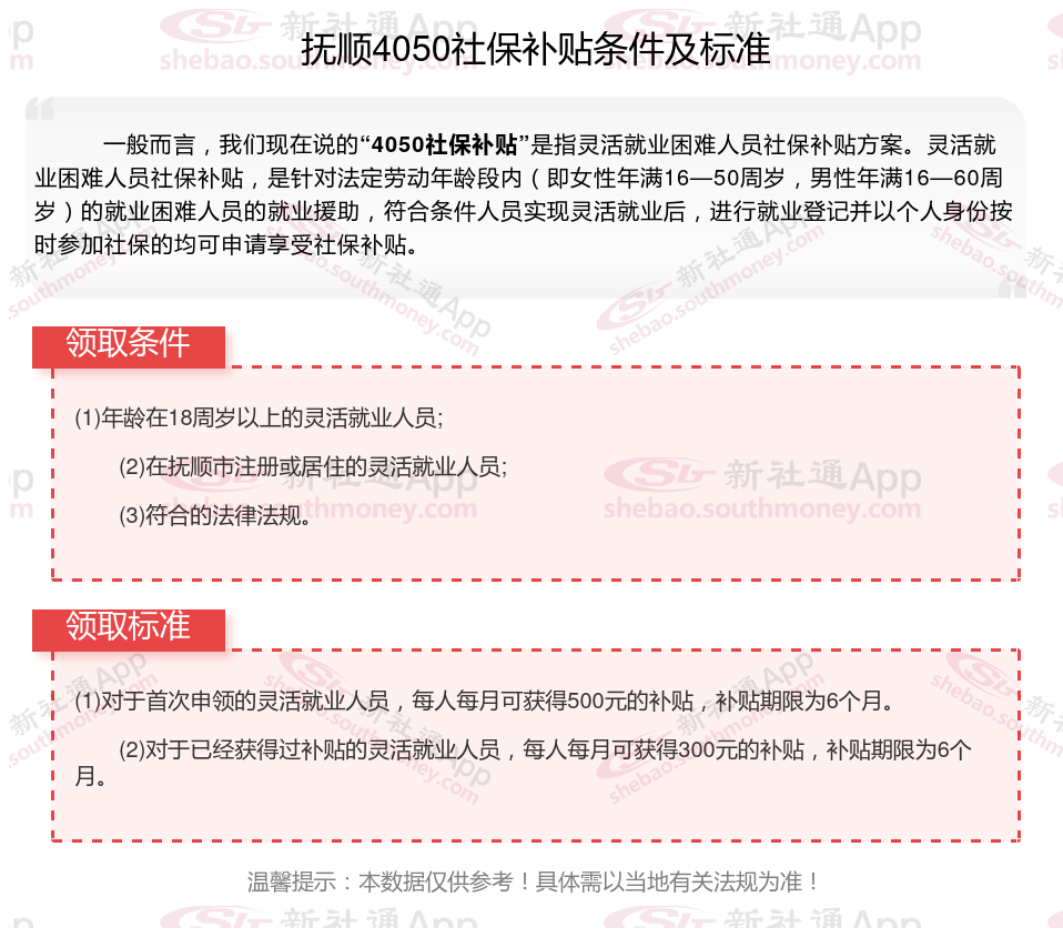 二、2025年抚顺4050社保补贴标准及条件,最新如下: