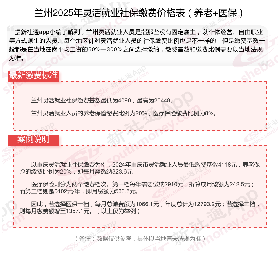 据新社通app数据显示,2024-2025年兰州灵活就业人员养老保险的缴费标准是根据缴费基数来确定的: