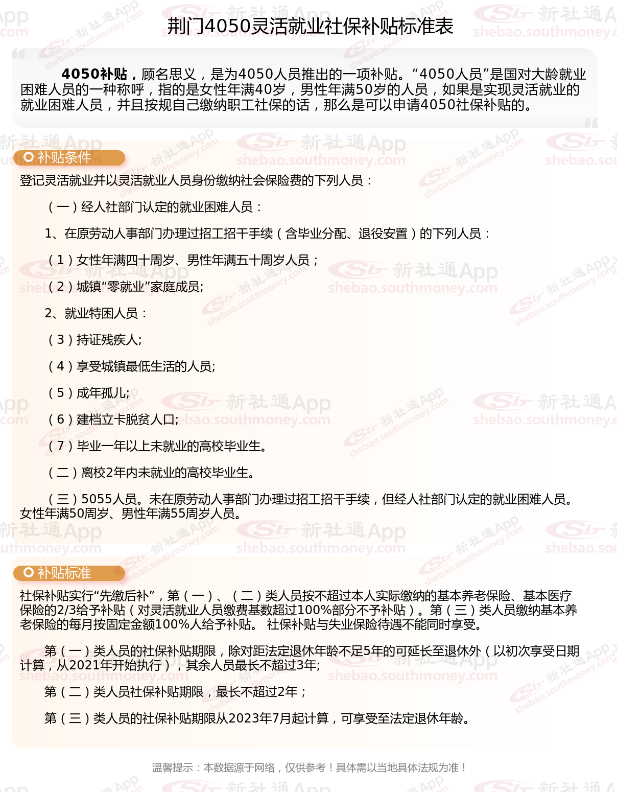 二、2025年荆门4050社保补贴标准及条件,最新如下: