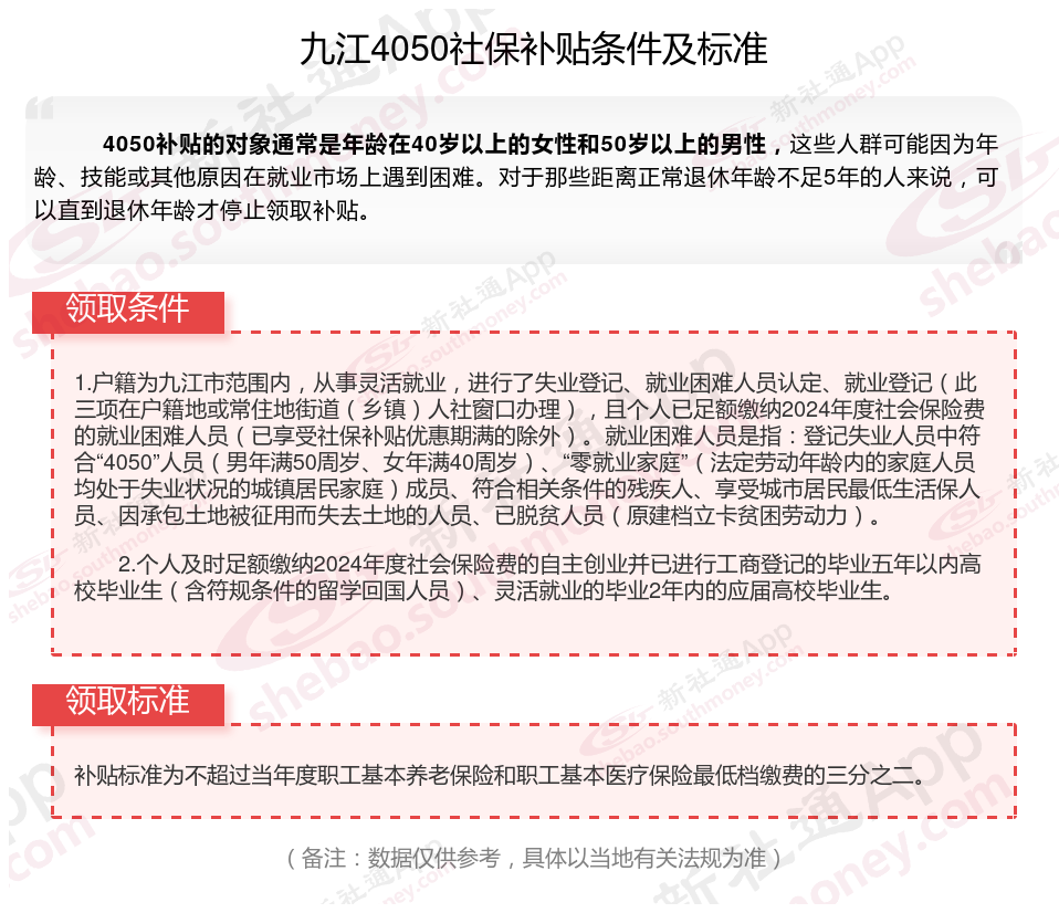一、九江4050社保补贴标准及条件2025年最新消息