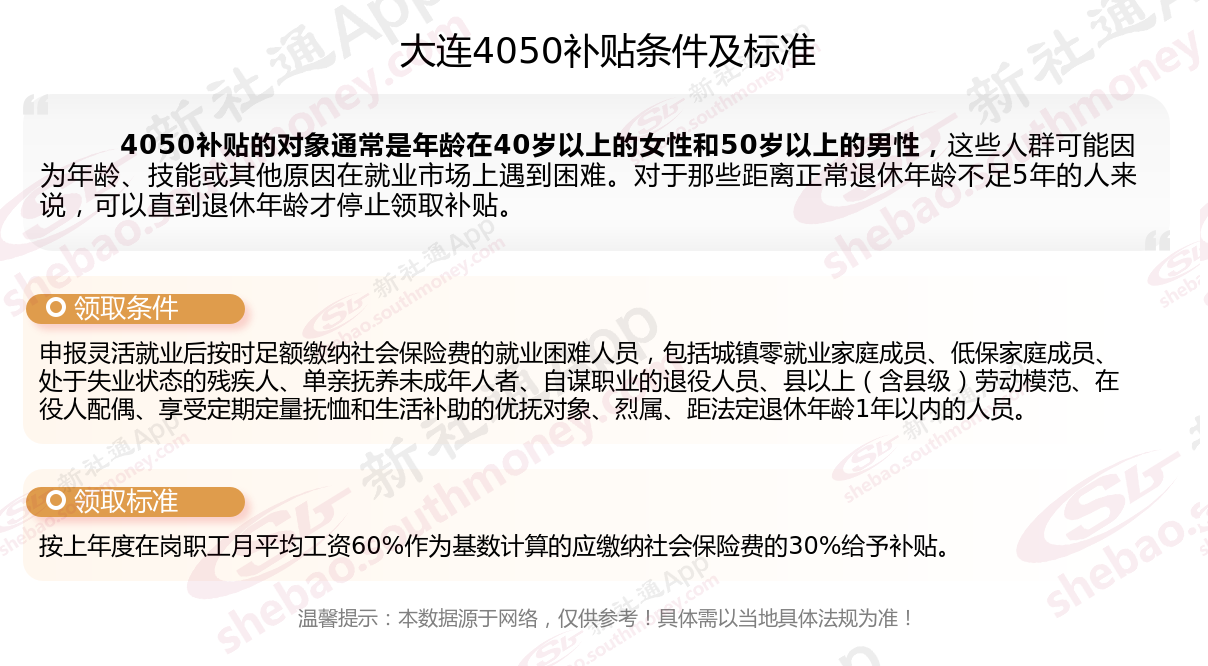 二、2025年大连4050社保补贴标准及条件,最新如下: