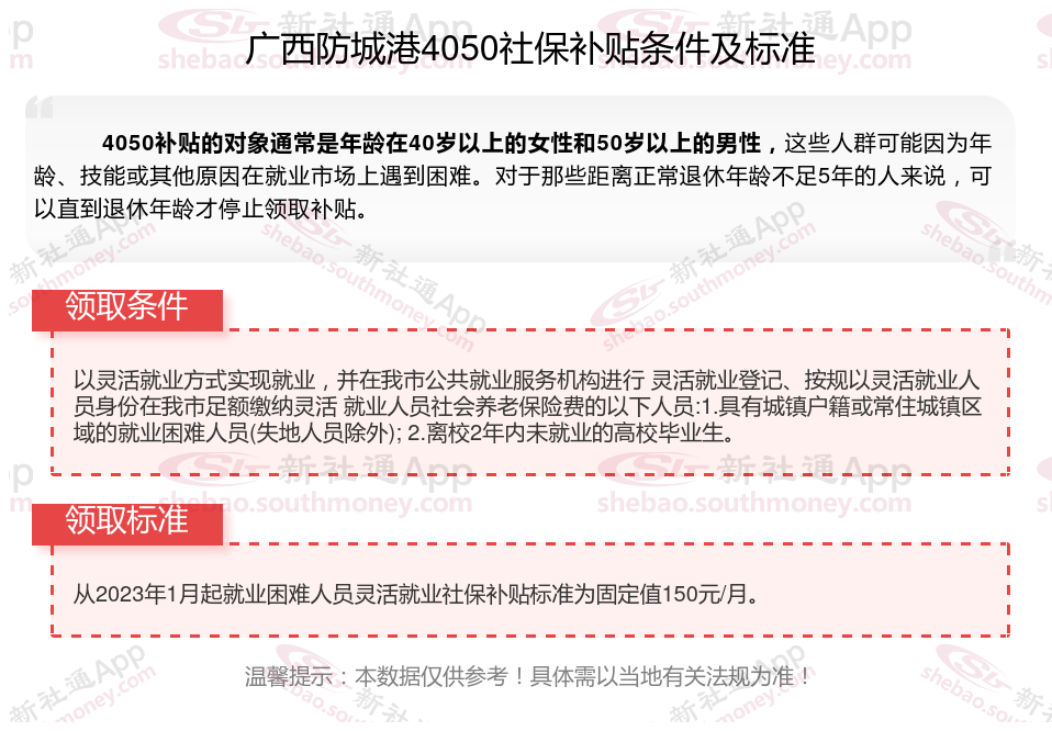 一、广西防城港4050社保补贴标准及条件2025年最新消息