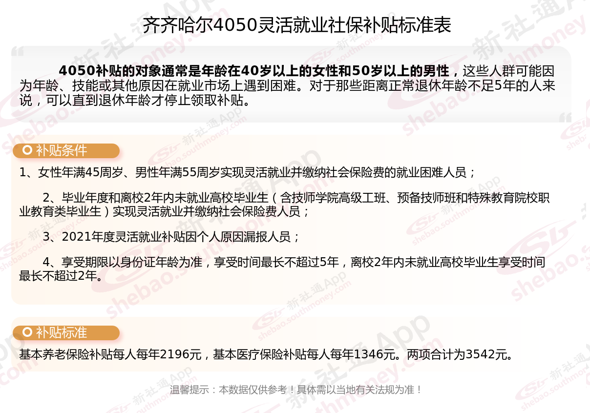 二、2025年齐齐哈尔4050社保补贴标准及条件