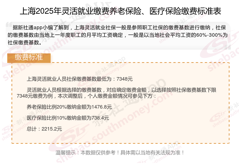 2025年上海灵活就业人员社保需要交多少钱?灵活就业社保缴费比例是多少?养老保险一般为缴费基数的20%左右,其中8%计入个人账户,12%计入统筹账户。医疗保险一般为缴费基数的10%左右,具体比例因地区而异。失业保险、工伤保险、生育保险缴费比例较低,具体比例因地区而异。接下来随新社通APP小编一起来看看上海灵活就业人员社保缴费的内容。